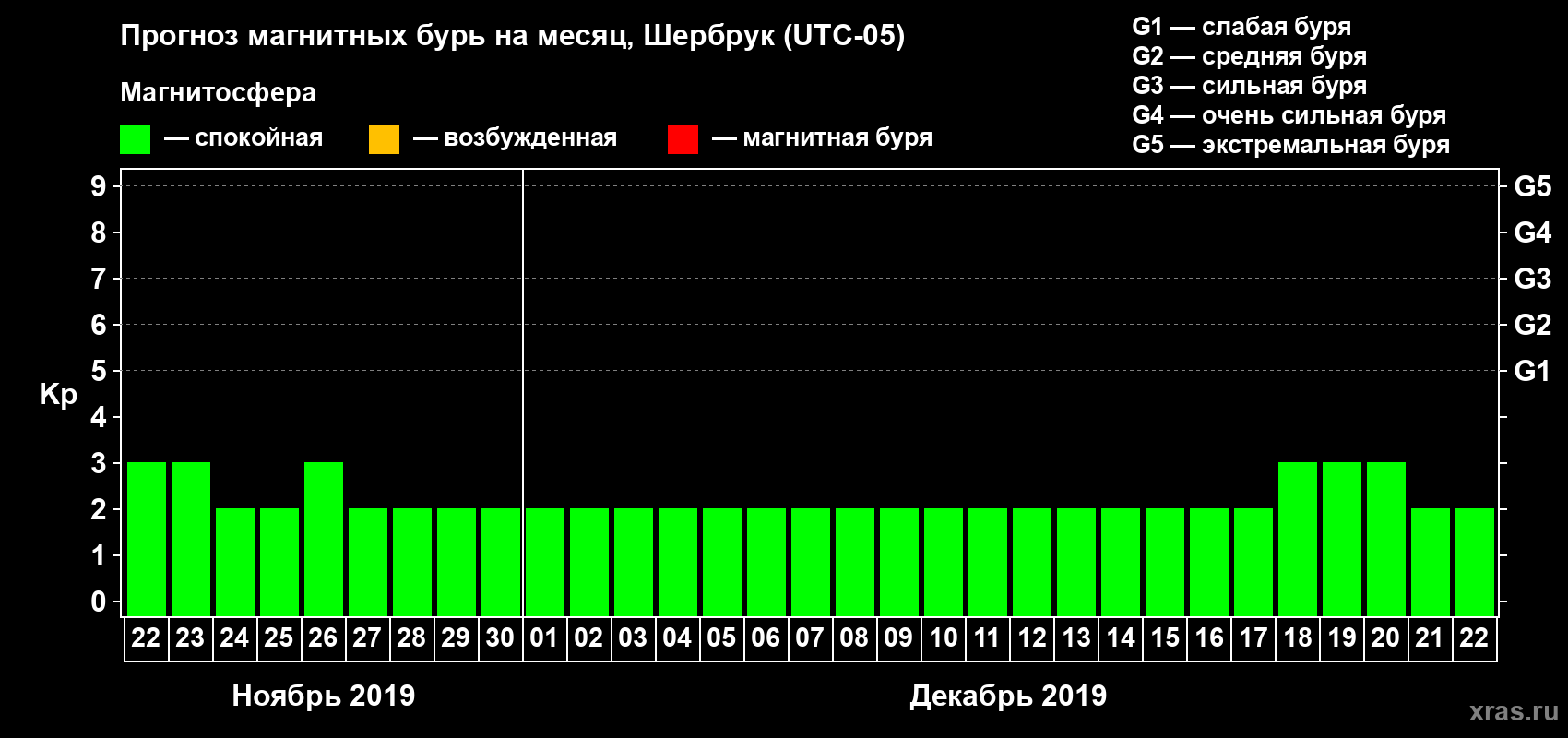 Прогноз магнитных бурь в Шербруке — 22 ноября 2019 года