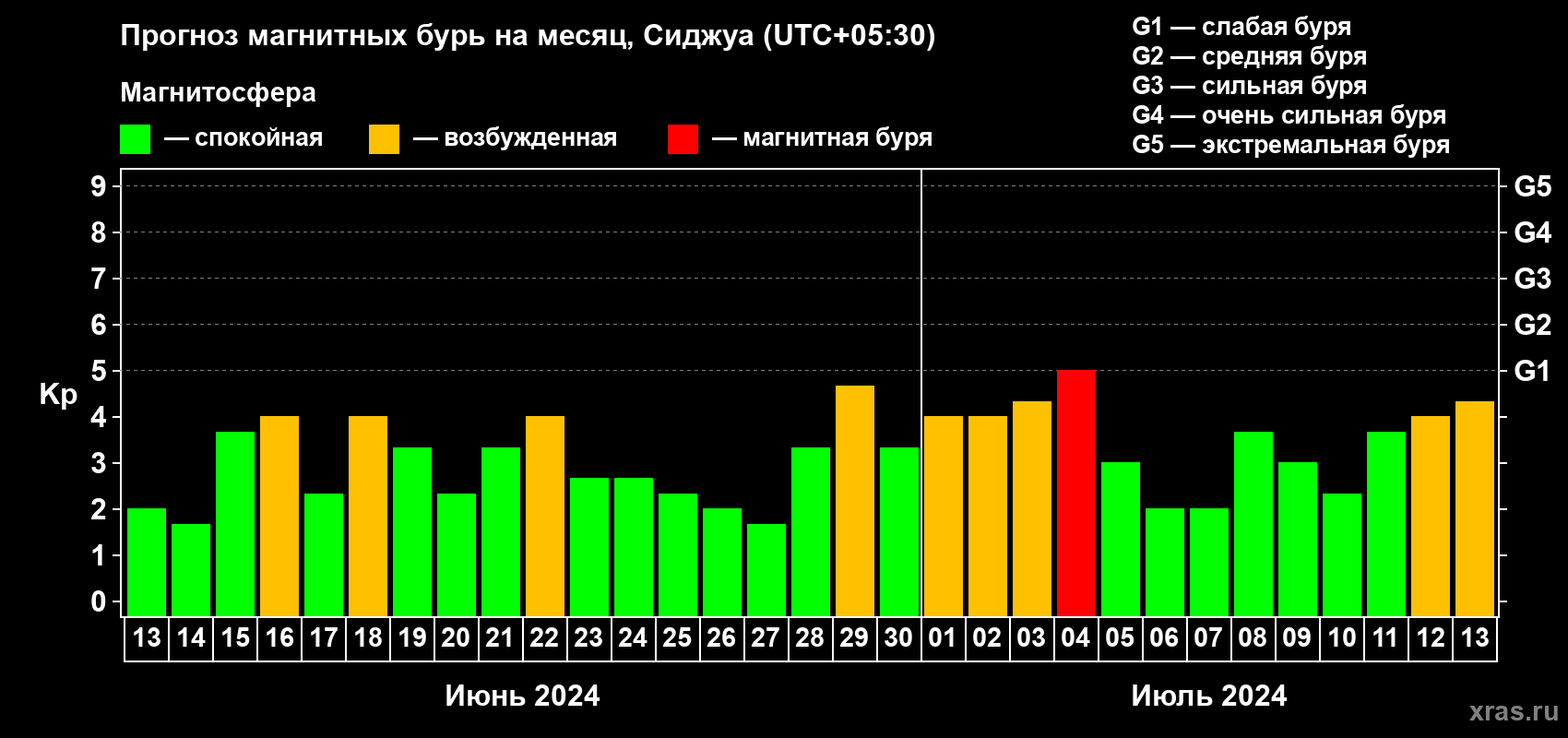 Прогноз магнитных бурь в Сиджуе — 13 июня 2024 года
