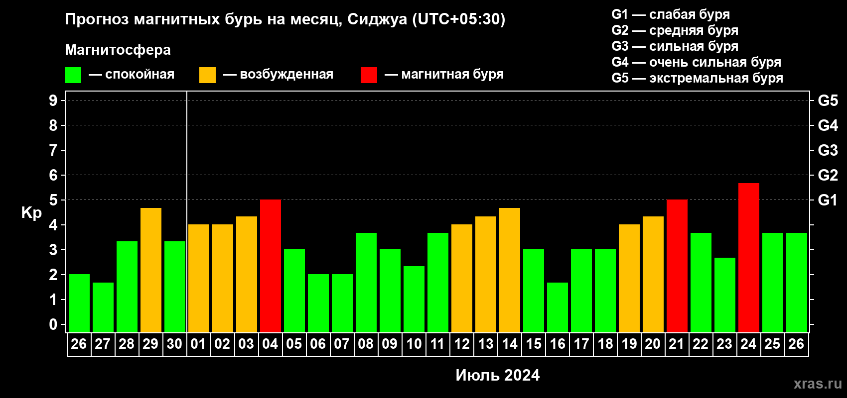 Прогноз магнитных бурь в Сиджуе — 26 июня 2024 года