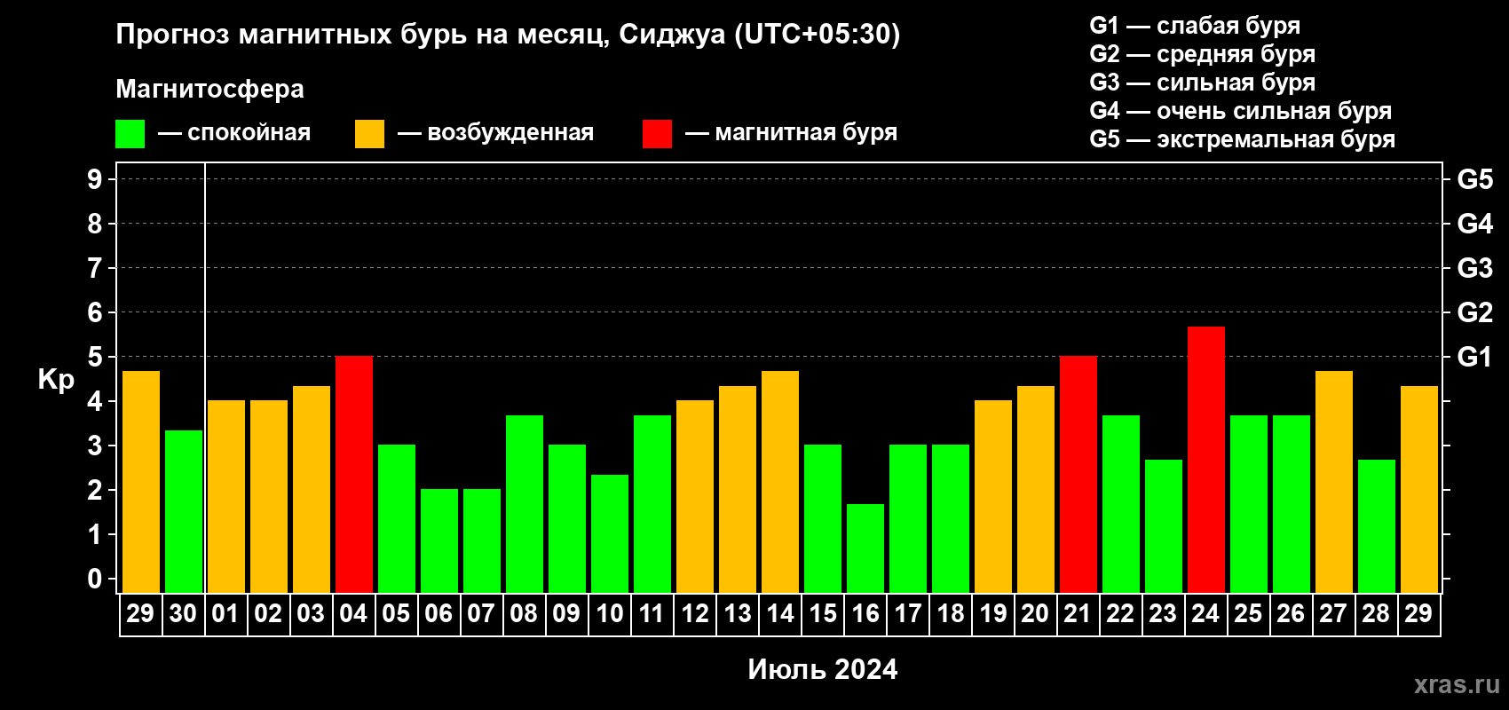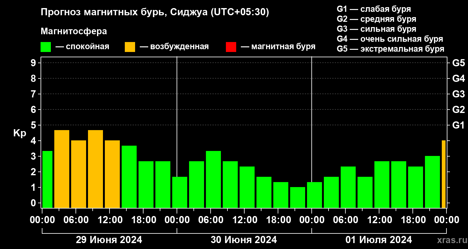 Прогноз магнитных бурь в Сиджуе — 29 июня 2024 года