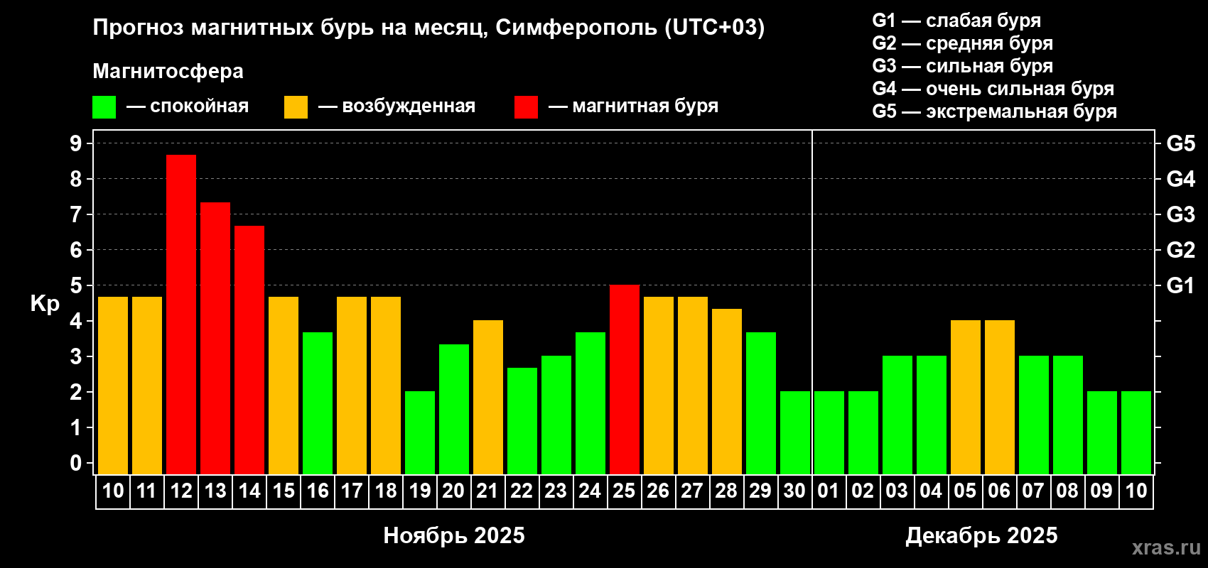 Прогноз магнитных бурь в Симферополе — 10 ноября 2025 года