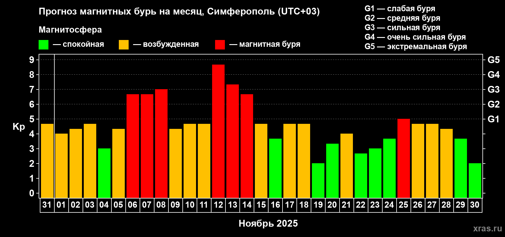 Прогноз магнитных бурь в Симферополе — 31 октября 2025 года