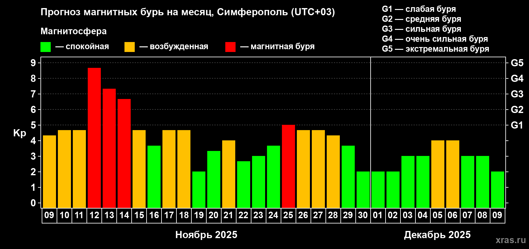 Прогноз магнитных бурь в Симферополе — 9 ноября 2025 года
