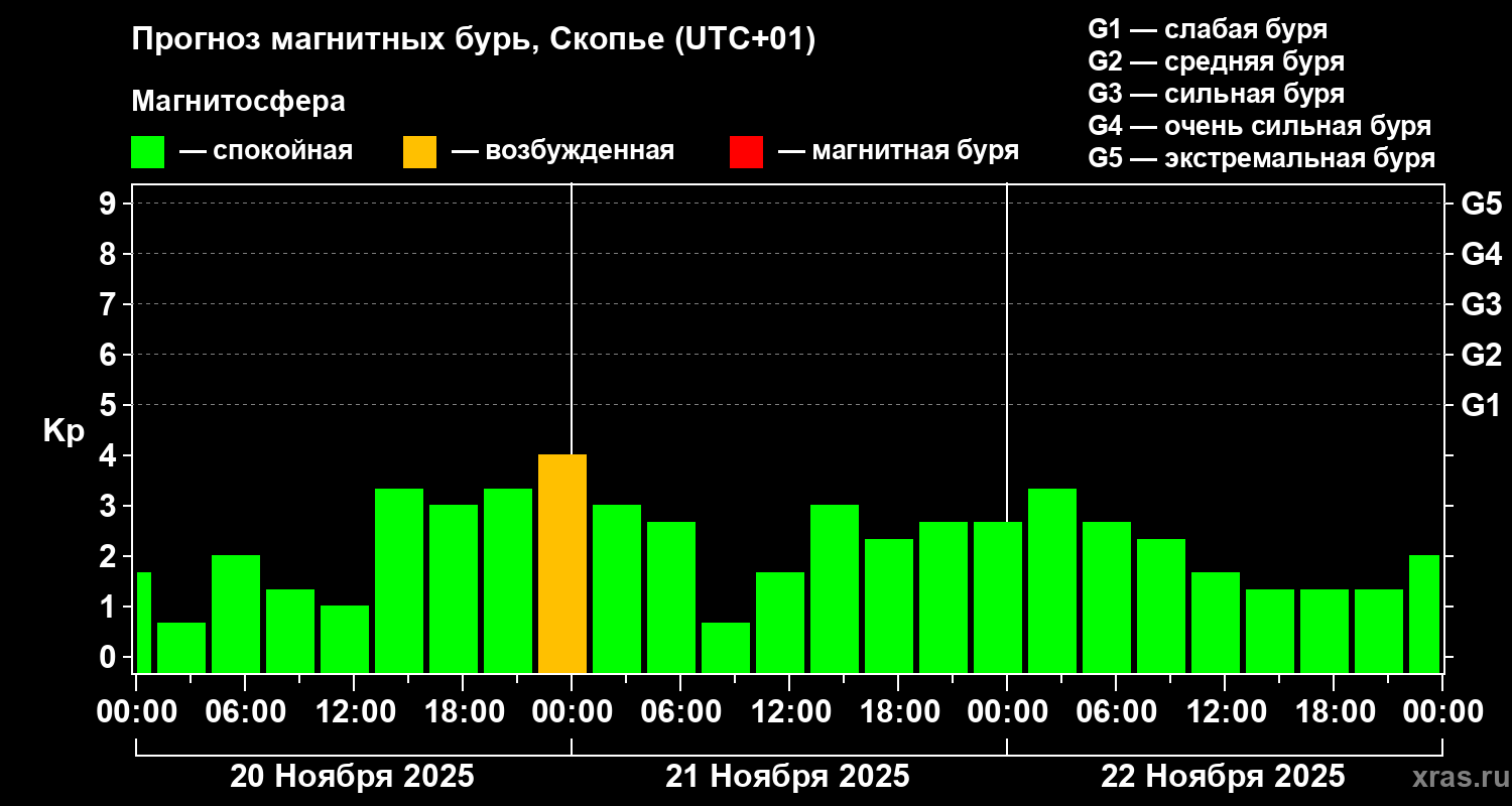 Прогноз магнитных бурь в Скопье на 20 ноября 2025 года