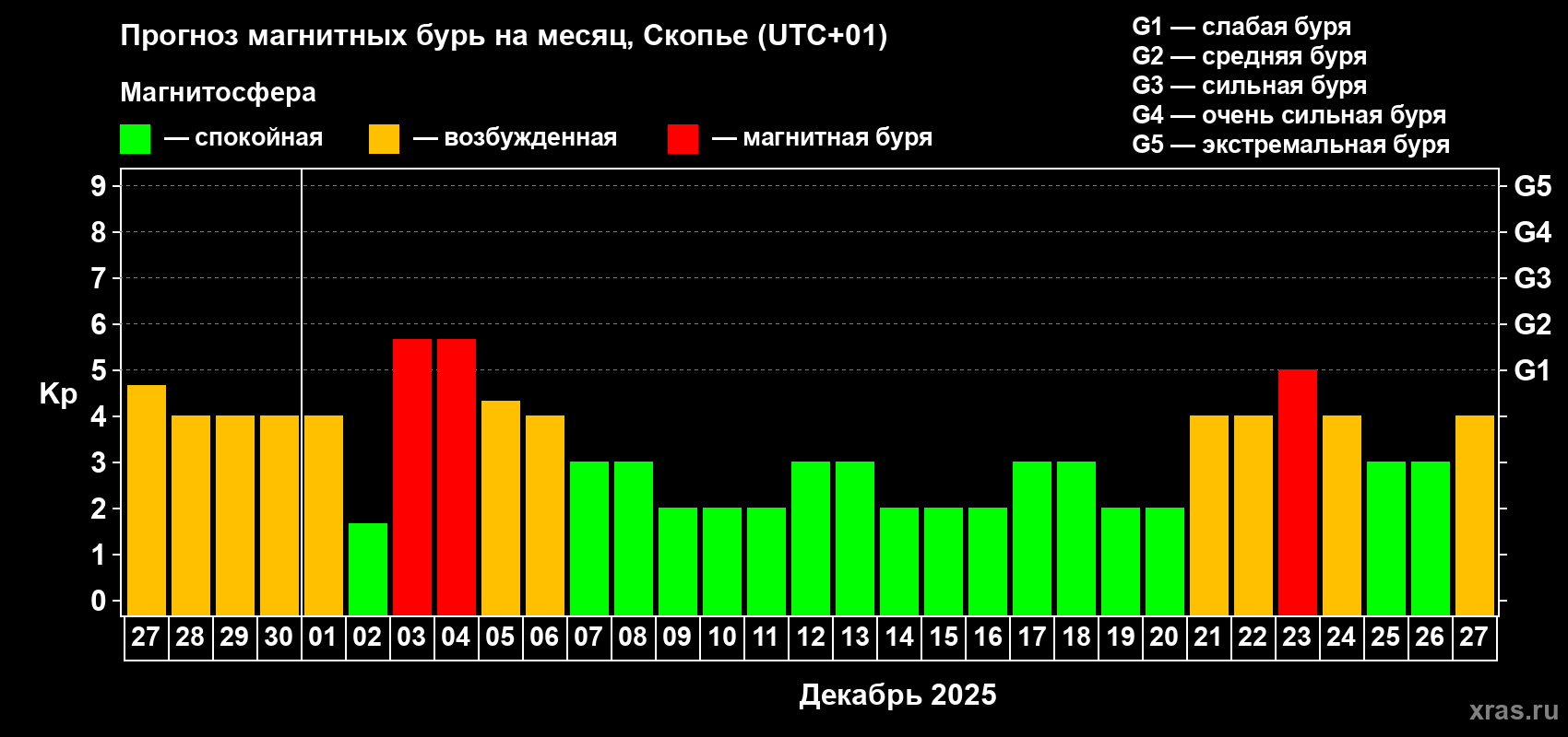 Прогноз магнитных бурь в Скопье — 27 ноября 2025 года