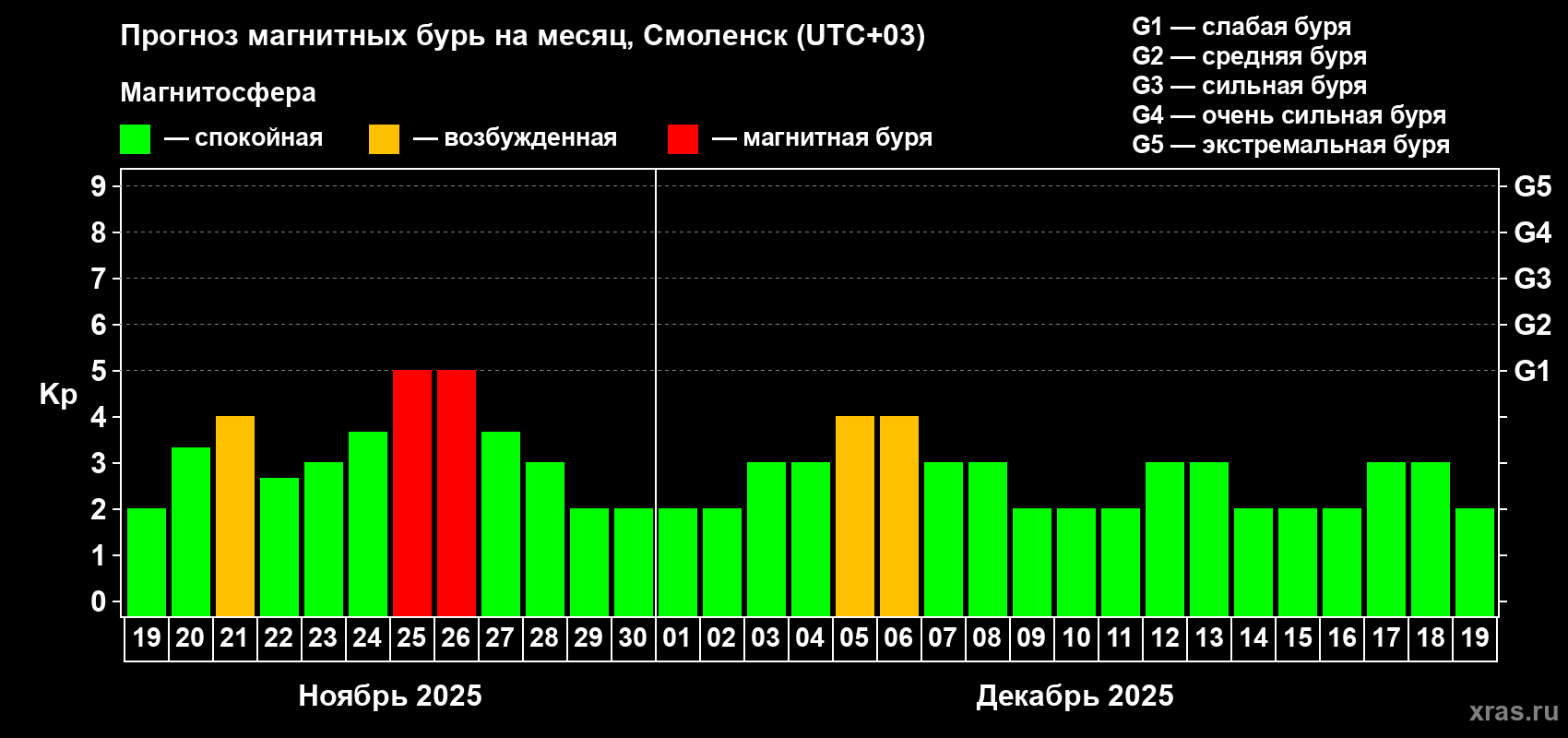 Прогноз магнитных бурь в Смоленске — 19 ноября 2025 года