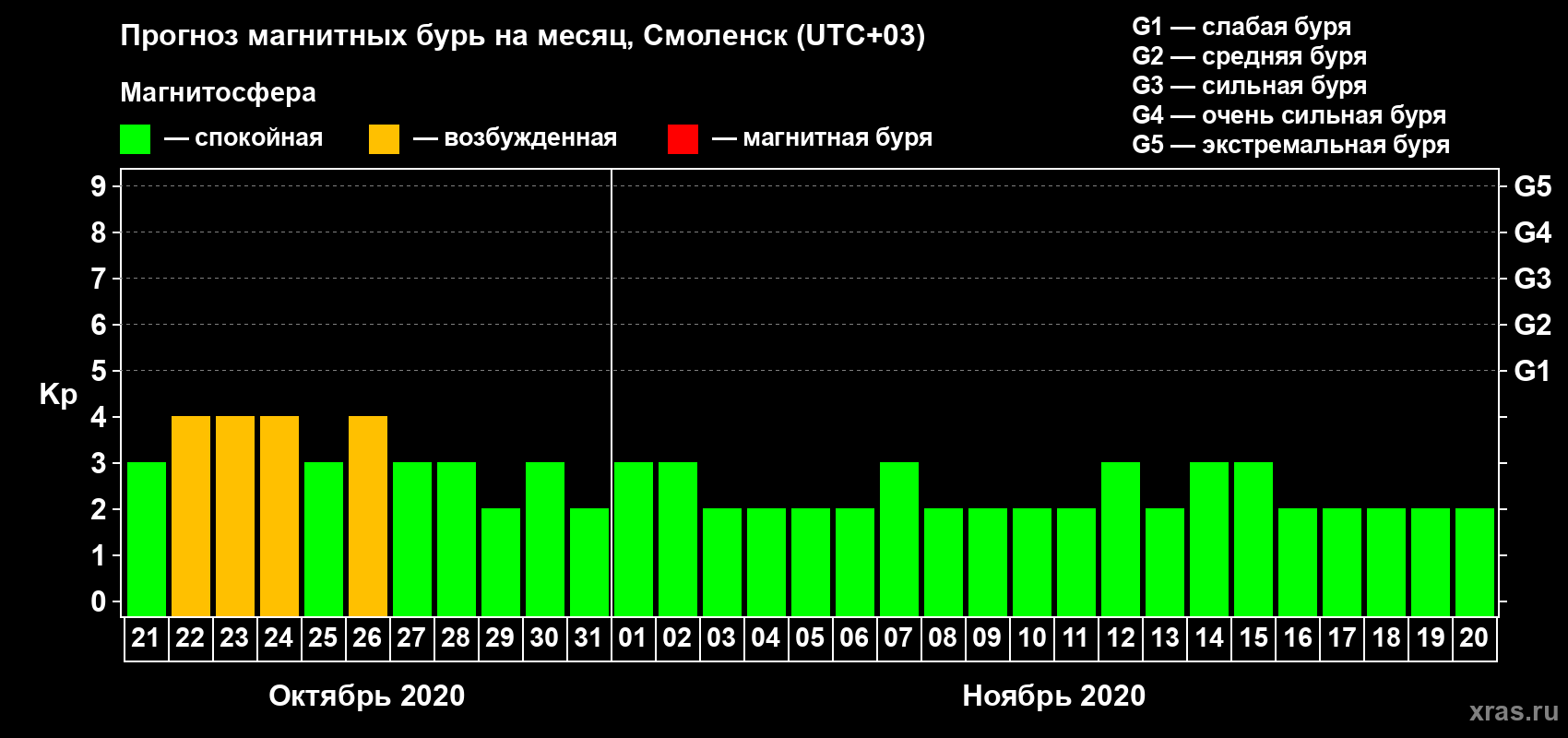 Прогноз магнитных бурь в Смоленске — 21 октября 2020 года