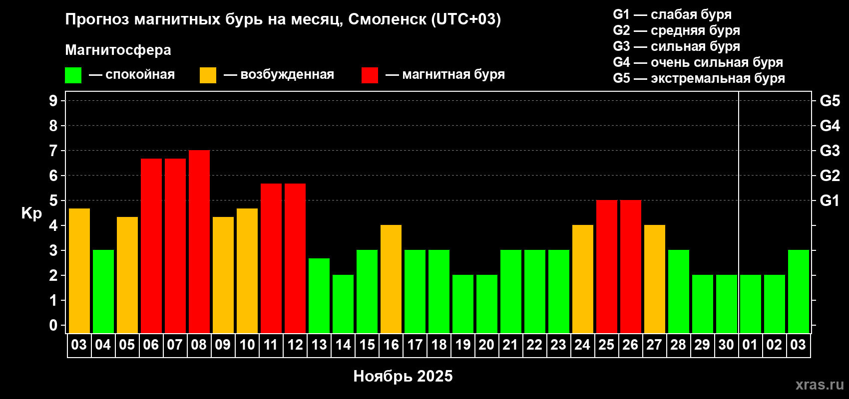 Прогноз магнитных бурь в Смоленске на 3 ноября 2025 года