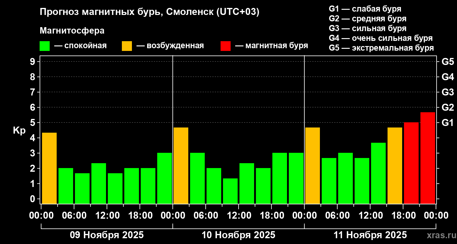 Прогноз магнитных бурь в Смоленске — 9 ноября 2025 года
