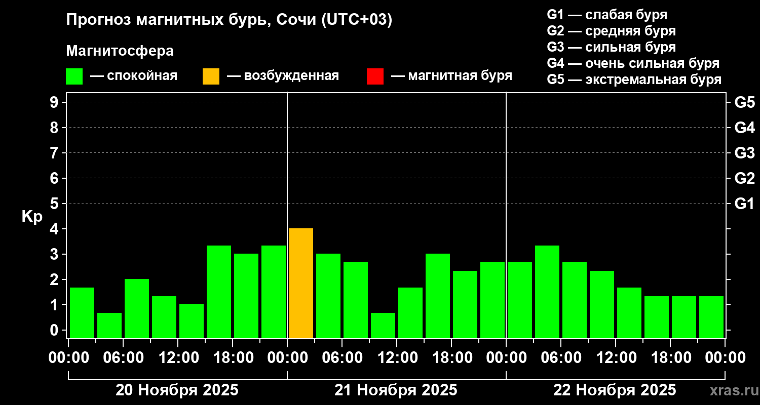 Прогноз магнитных бурь Сочи — 20 ноября 2025 года