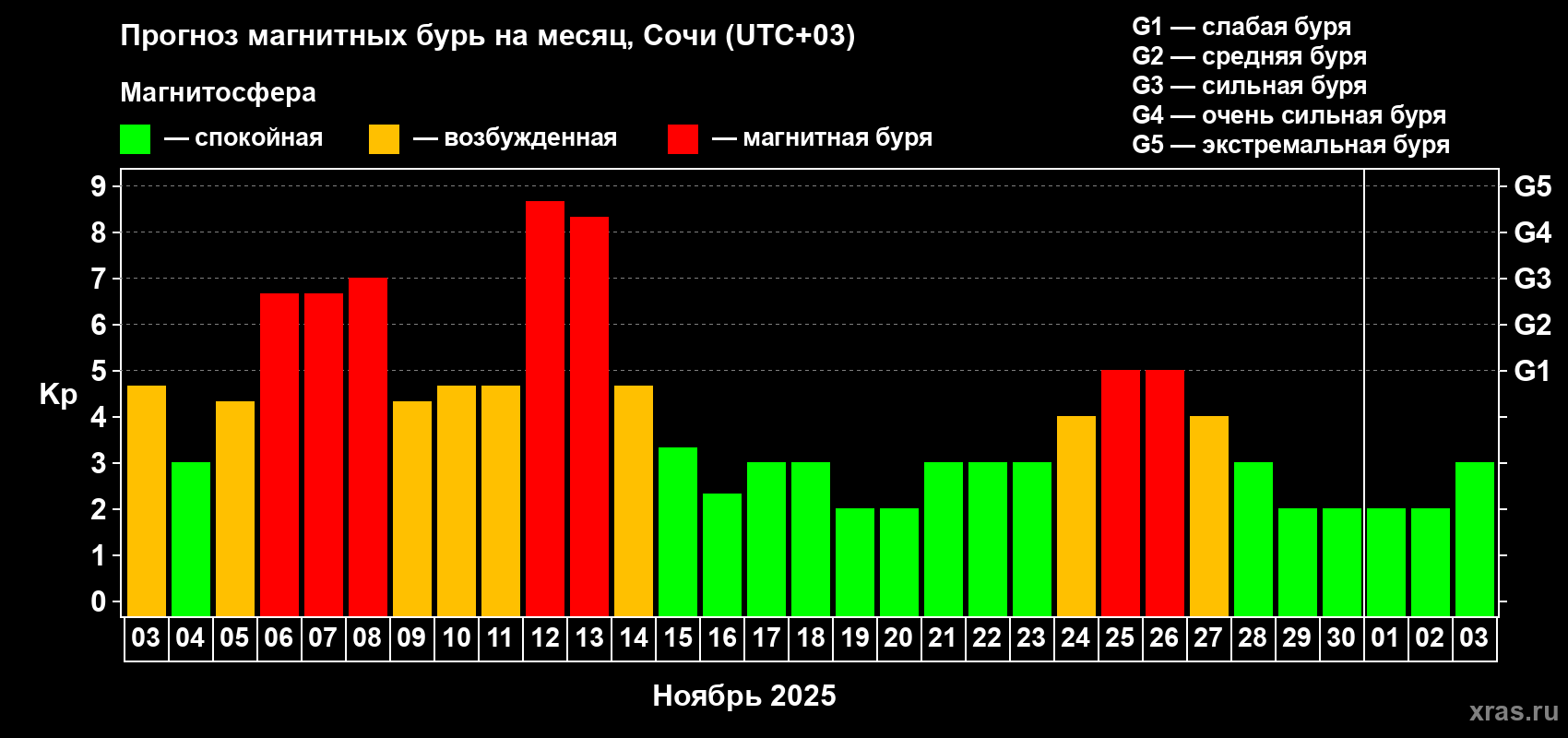 Прогноз магнитных бурь Сочи — 3 ноября 2025 года