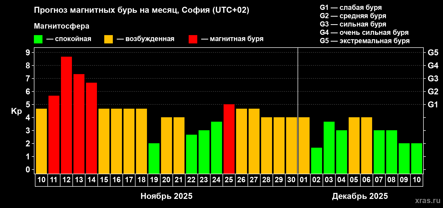 Прогноз магнитных бурь в Софии — 10 ноября 2025 года