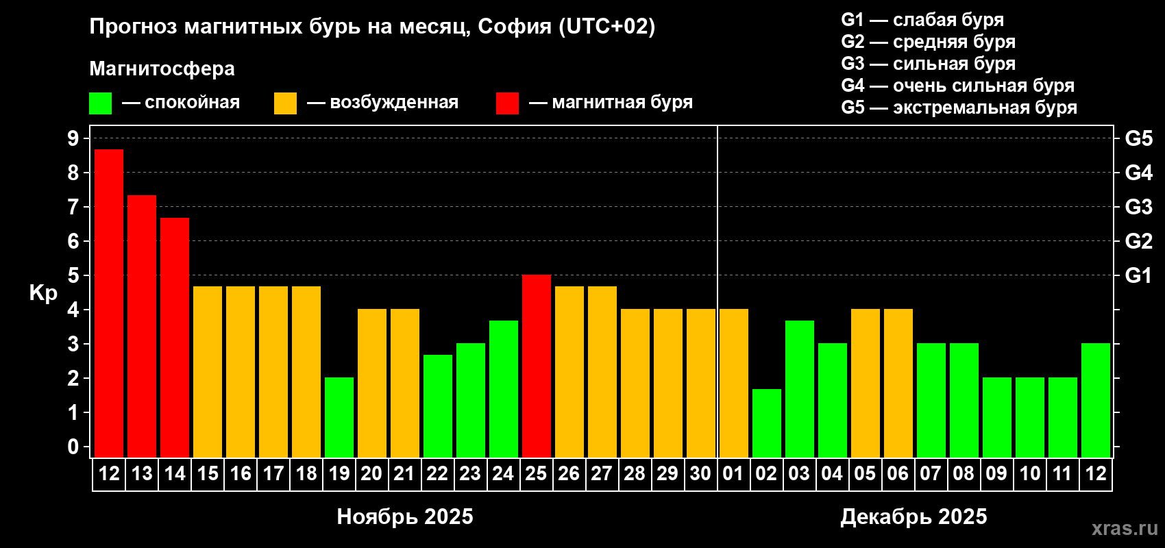 Прогноз магнитных бурь в Софии — 12 ноября 2025 года