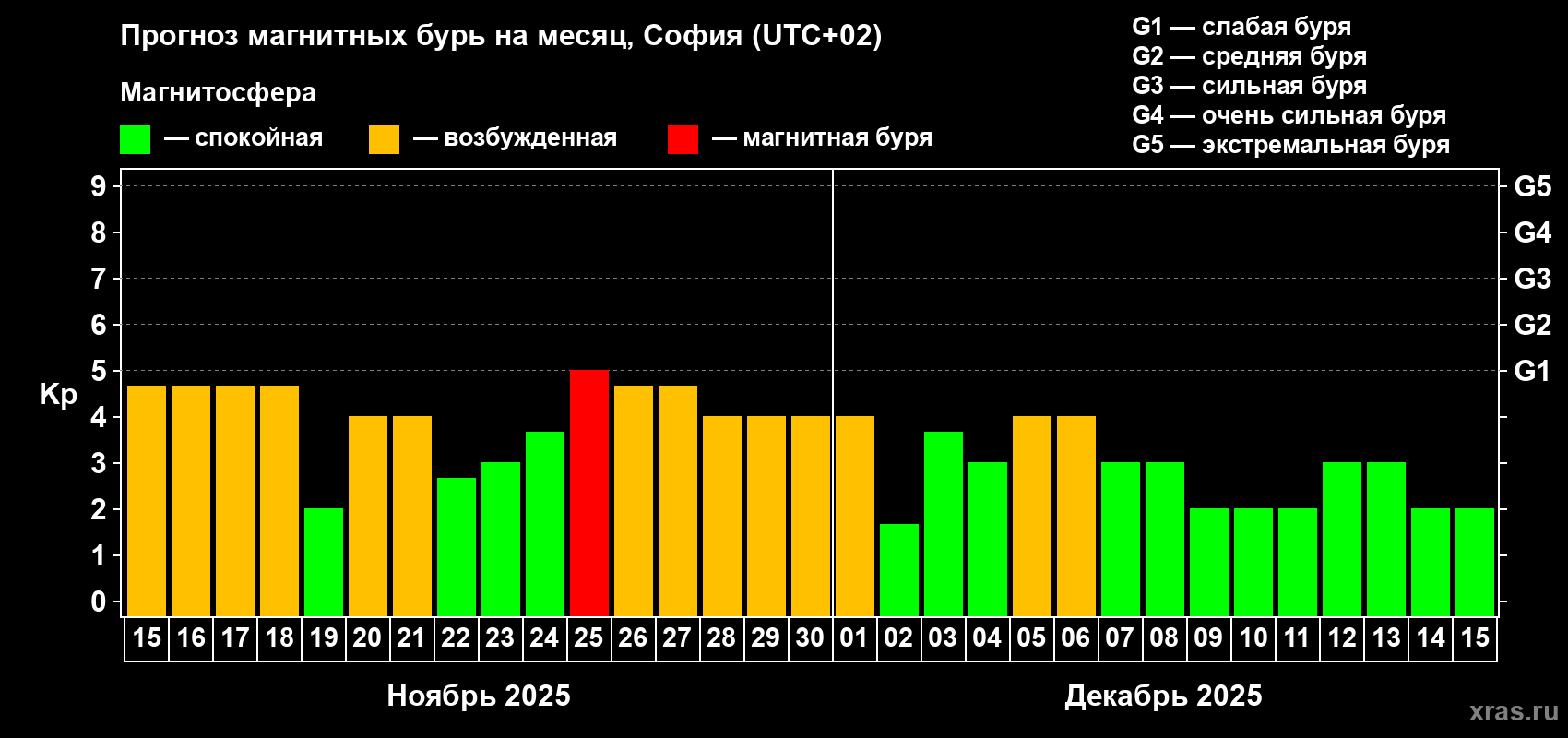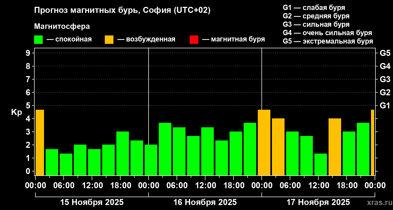 Прогноз магнитных бурь в Софии — 15 ноября 2025 года