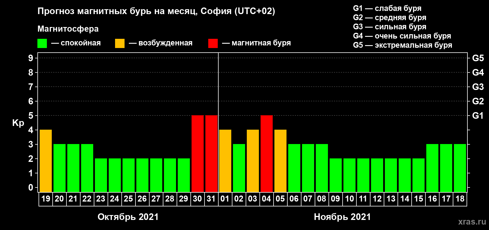 Прогноз магнитных бурь в Софии — 19 октября 2021 года