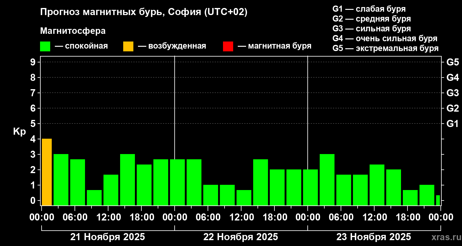 Прогноз магнитных бурь в Софии — 21 ноября 2025 года