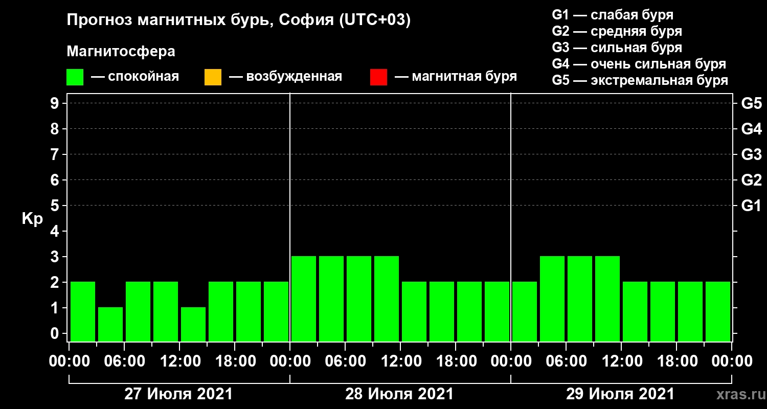 Прогноз магнитных бурь в Софии — 27 июля 2021 года