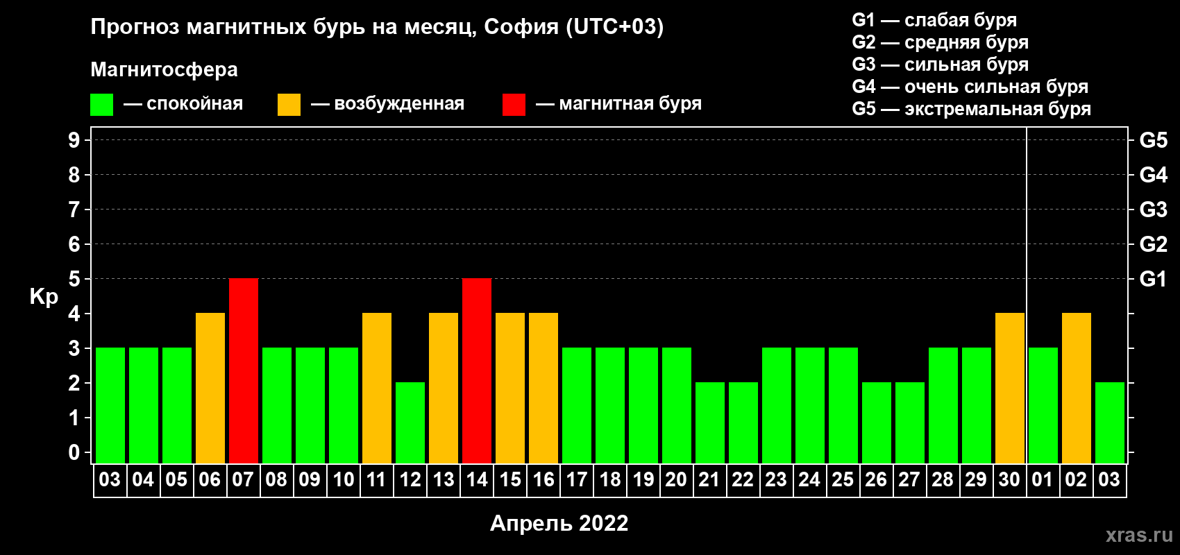 Прогноз магнитных бурь в Софии — 3 апреля 2022 года