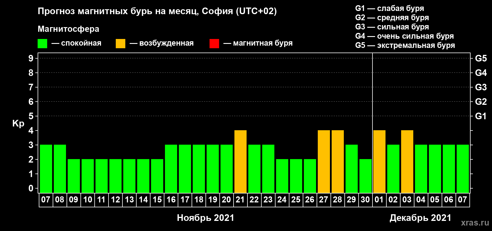 Прогноз магнитных бурь в Софии — 7 ноября 2021 года