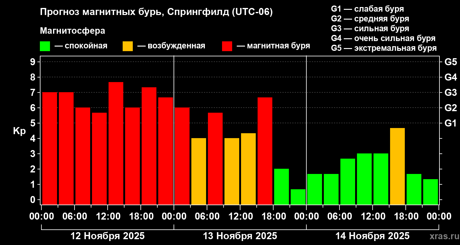 Прогноз магнитных бурь в Спрингфилде на 12 ноября 2025 года