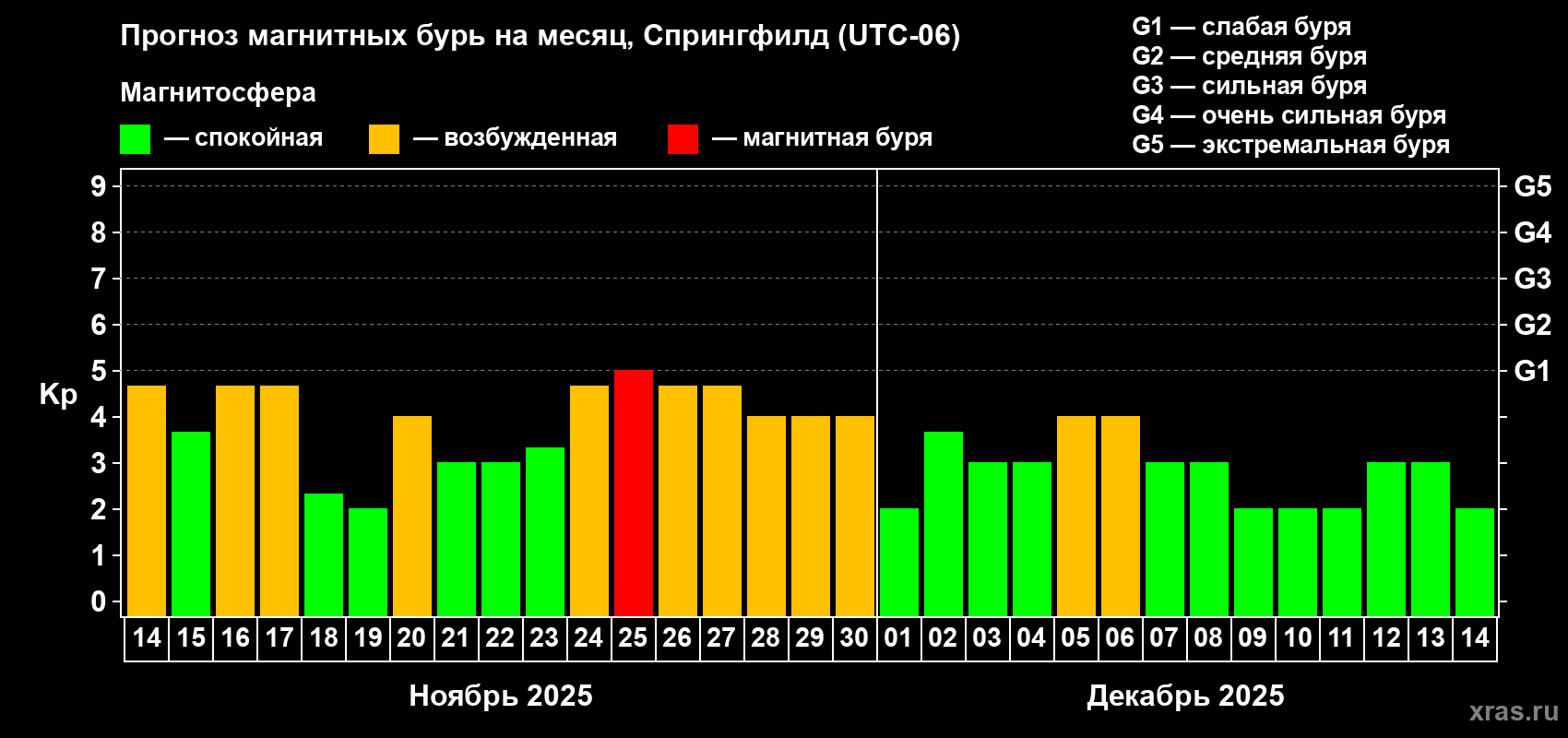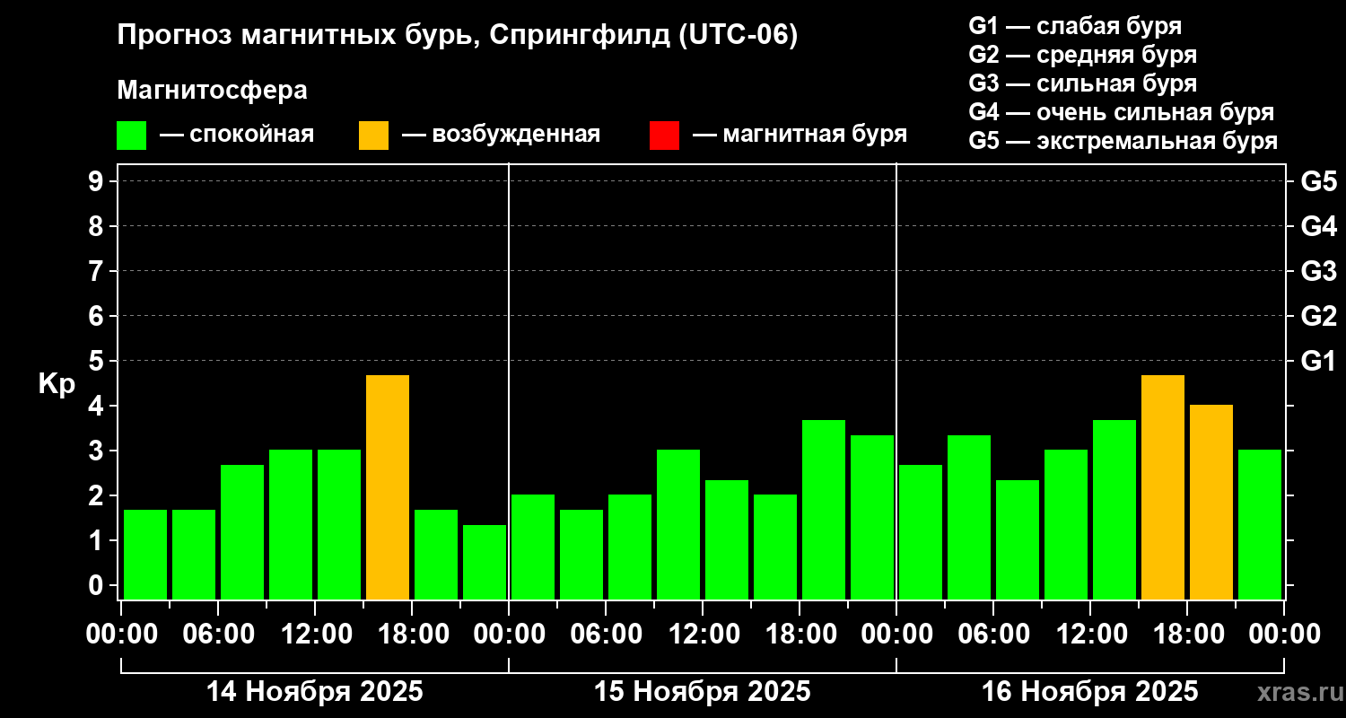 Прогноз магнитных бурь в Спрингфилде — 14 ноября 2025 года