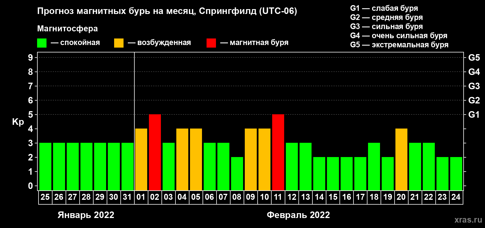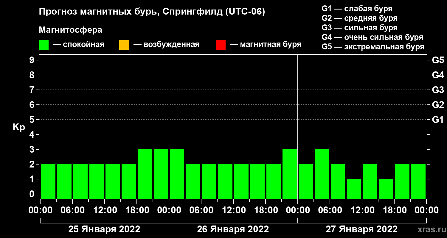 Прогноз магнитных бурь в Спрингфилде на 25 января 2022 года