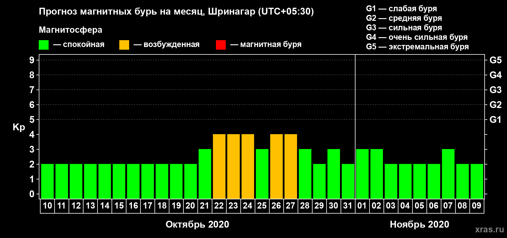 Прогноз магнитных бурь в Шринагаре — 10 октября 2020 года