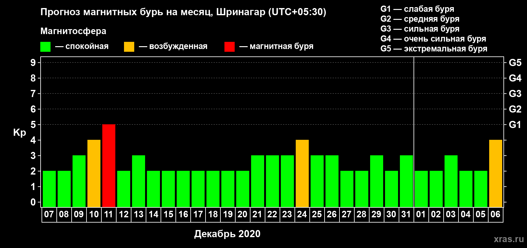 Прогноз магнитных бурь в Шринагаре — 7 декабря 2020 года