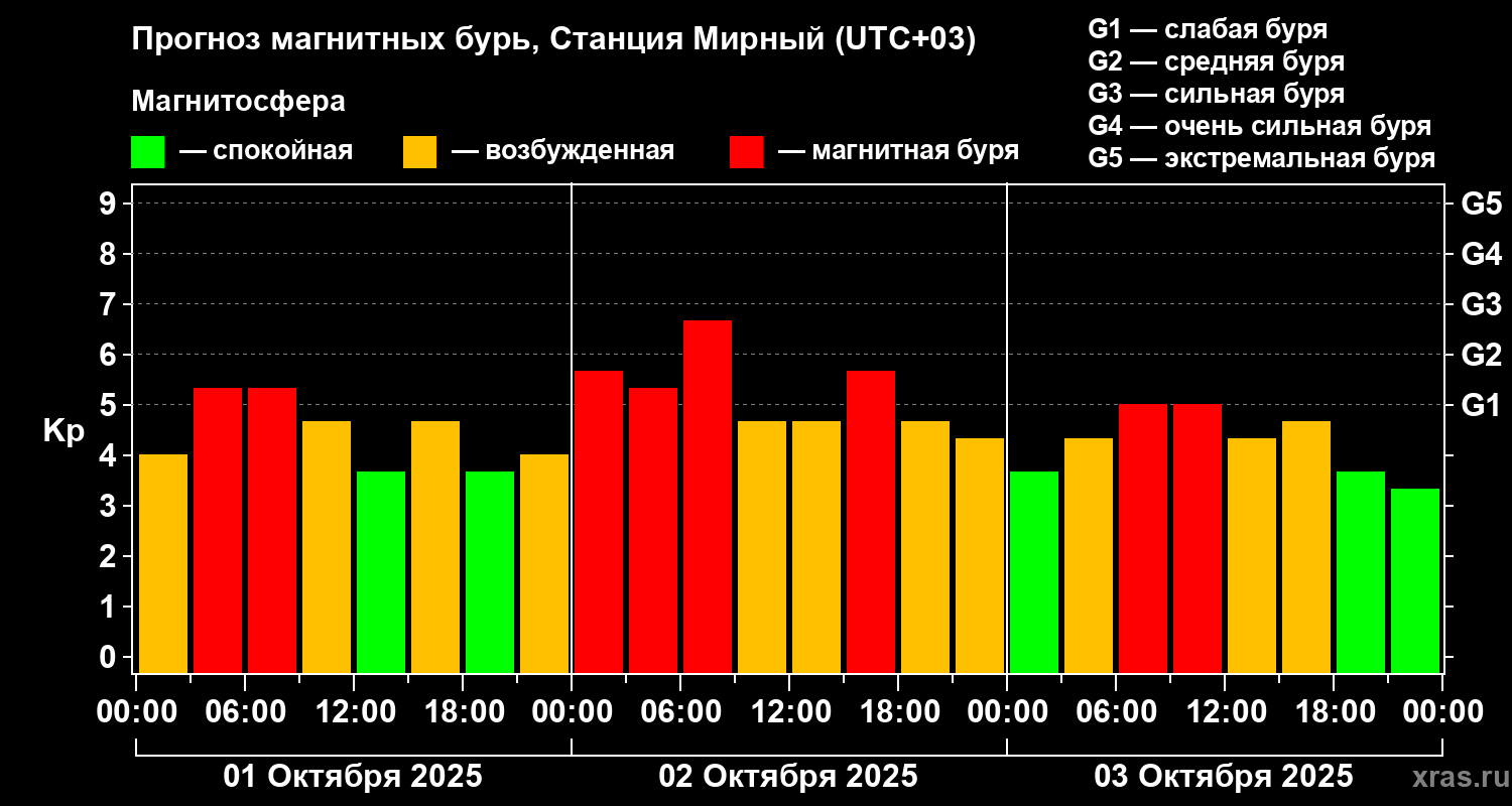 Прогноз магнитных бурь локации Станция Мирный — 1 октября 2025 года