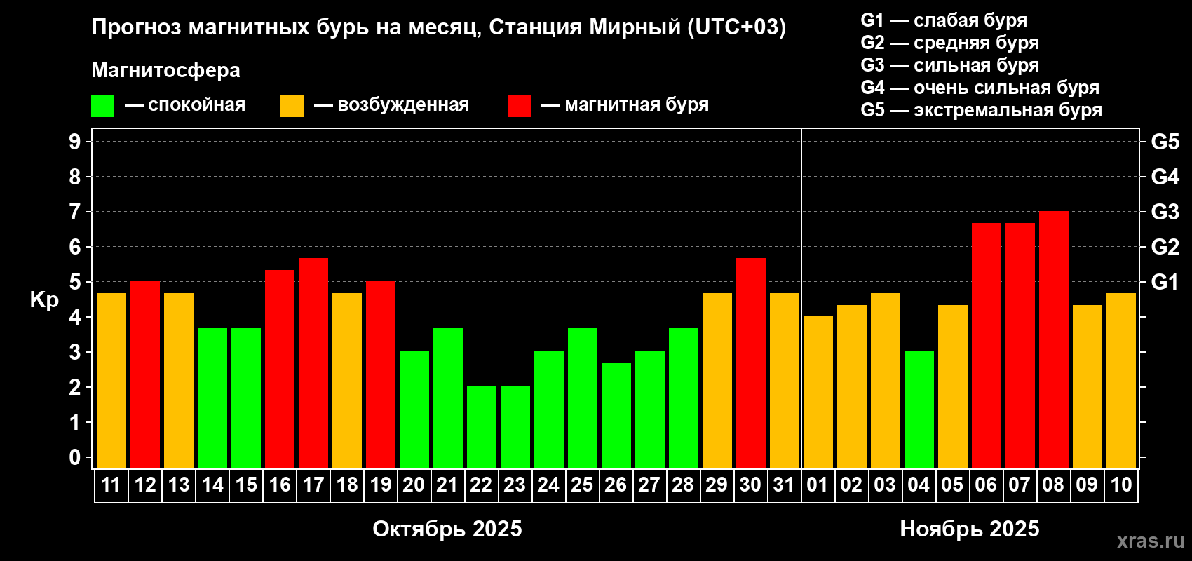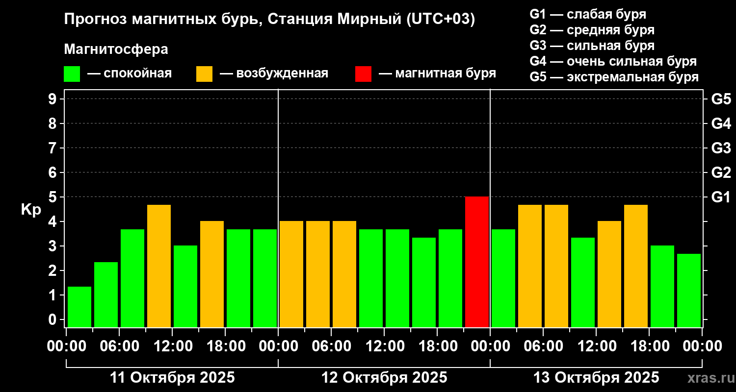 Прогноз магнитных бурь локации Станция Мирный — 11 октября 2025 года