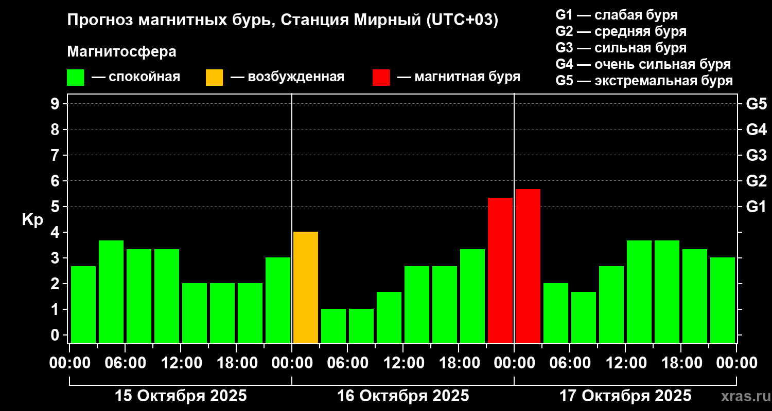Прогноз магнитных бурь локации Станция Мирный — 15 октября 2025 года