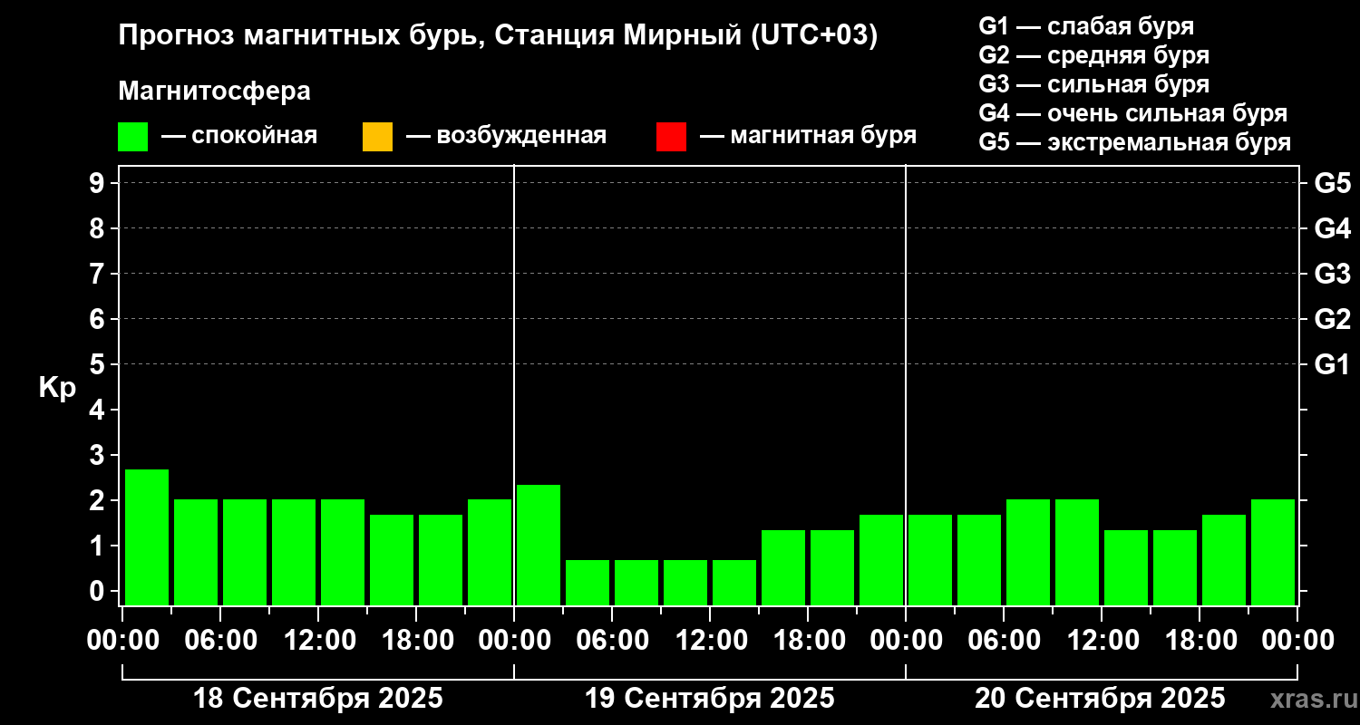 Прогноз магнитных бурь локации Станция Мирный — 18 сентября 2025 года