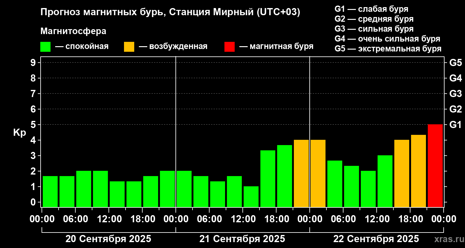 Прогноз магнитных бурь локации Станция Мирный — 20 сентября 2025 года