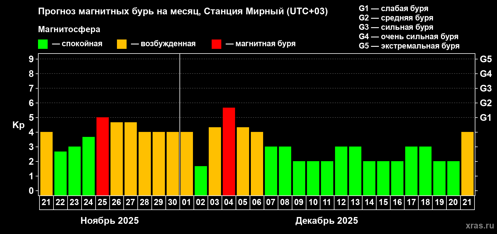 Прогноз магнитных бурь локации Станция Мирный на 21 ноября 2025 года