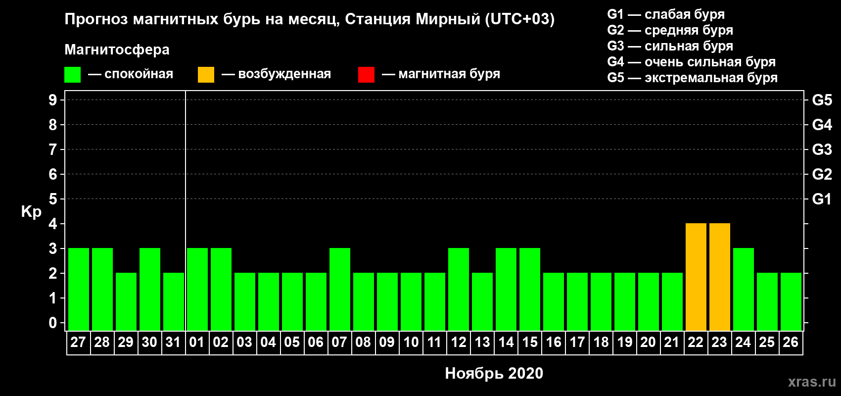 Прогноз магнитных бурь локации Станция Мирный — 27 октября 2020 года