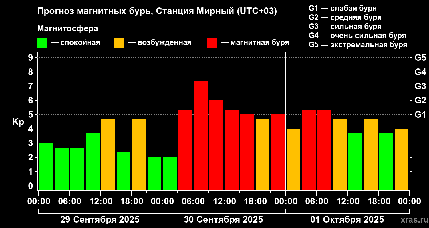 Прогноз магнитных бурь локации Станция Мирный на 29 сентября 2025 года