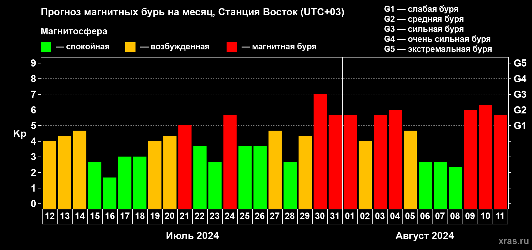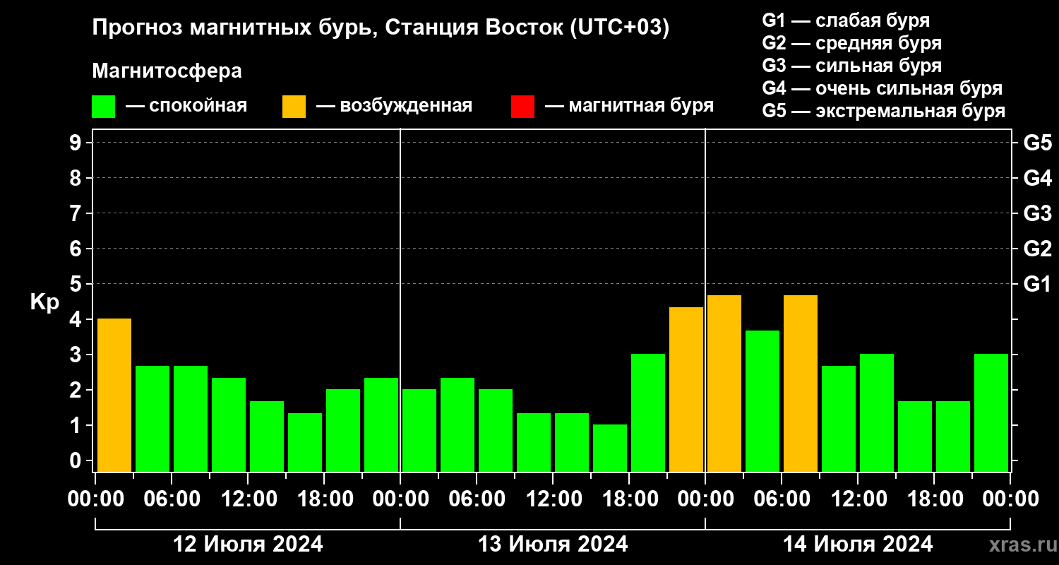 Прогноз магнитных бурь локации Станция Восток — 12 июля 2024 года