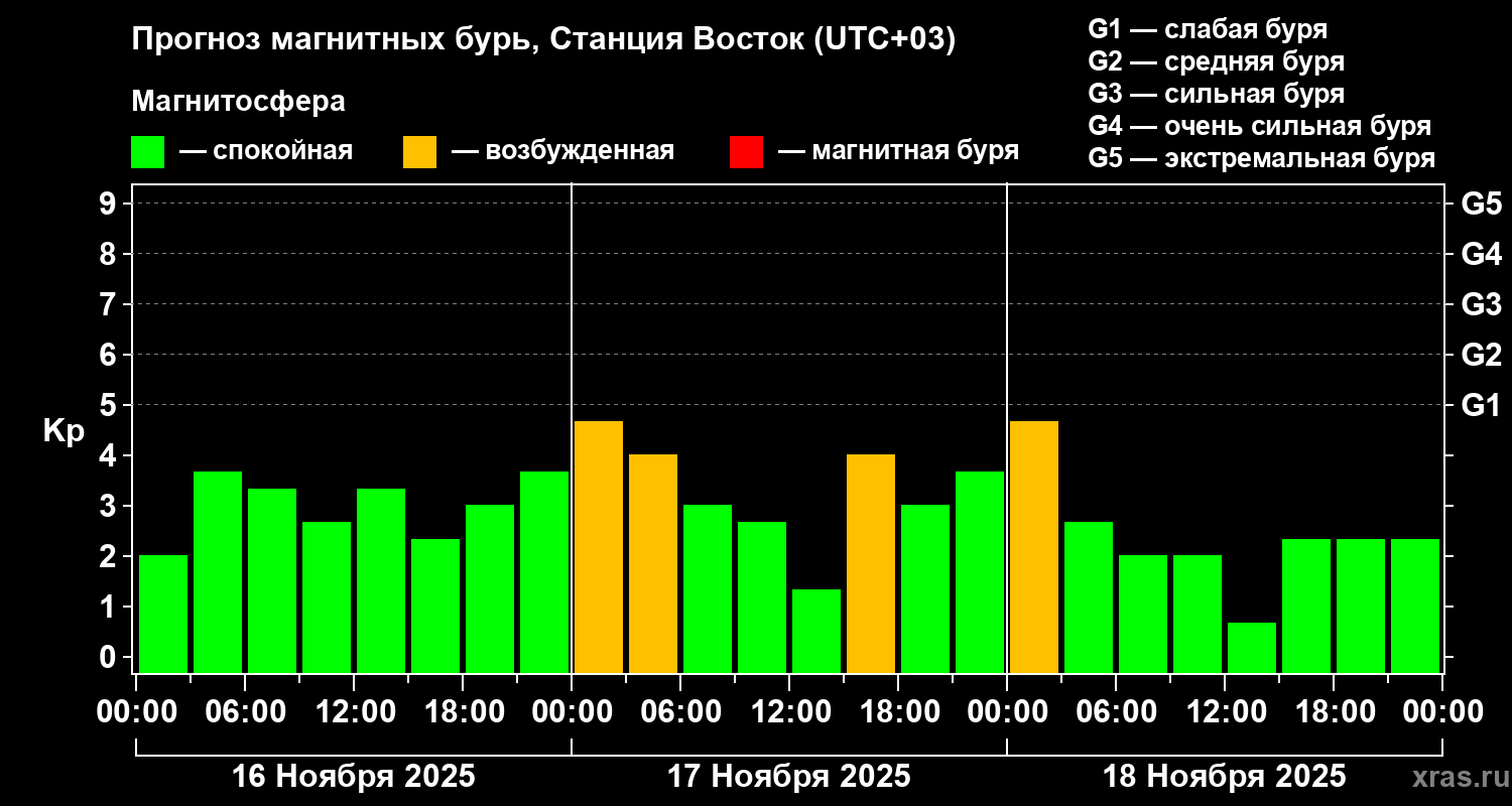 Прогноз магнитных бурь локации Станция Восток — 16 ноября 2025 года