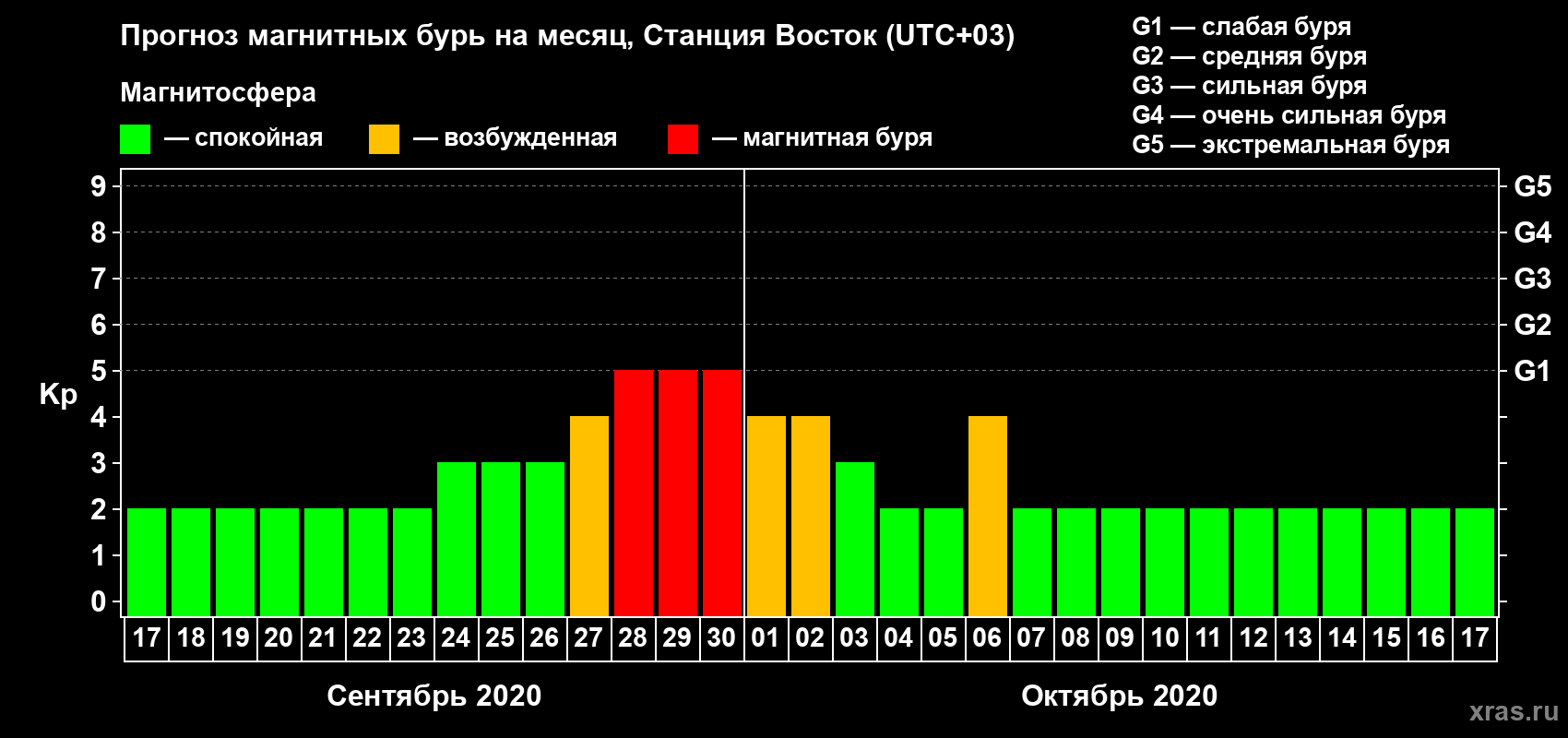 Прогноз магнитных бурь локации Станция Восток — 17 сентября 2020 года