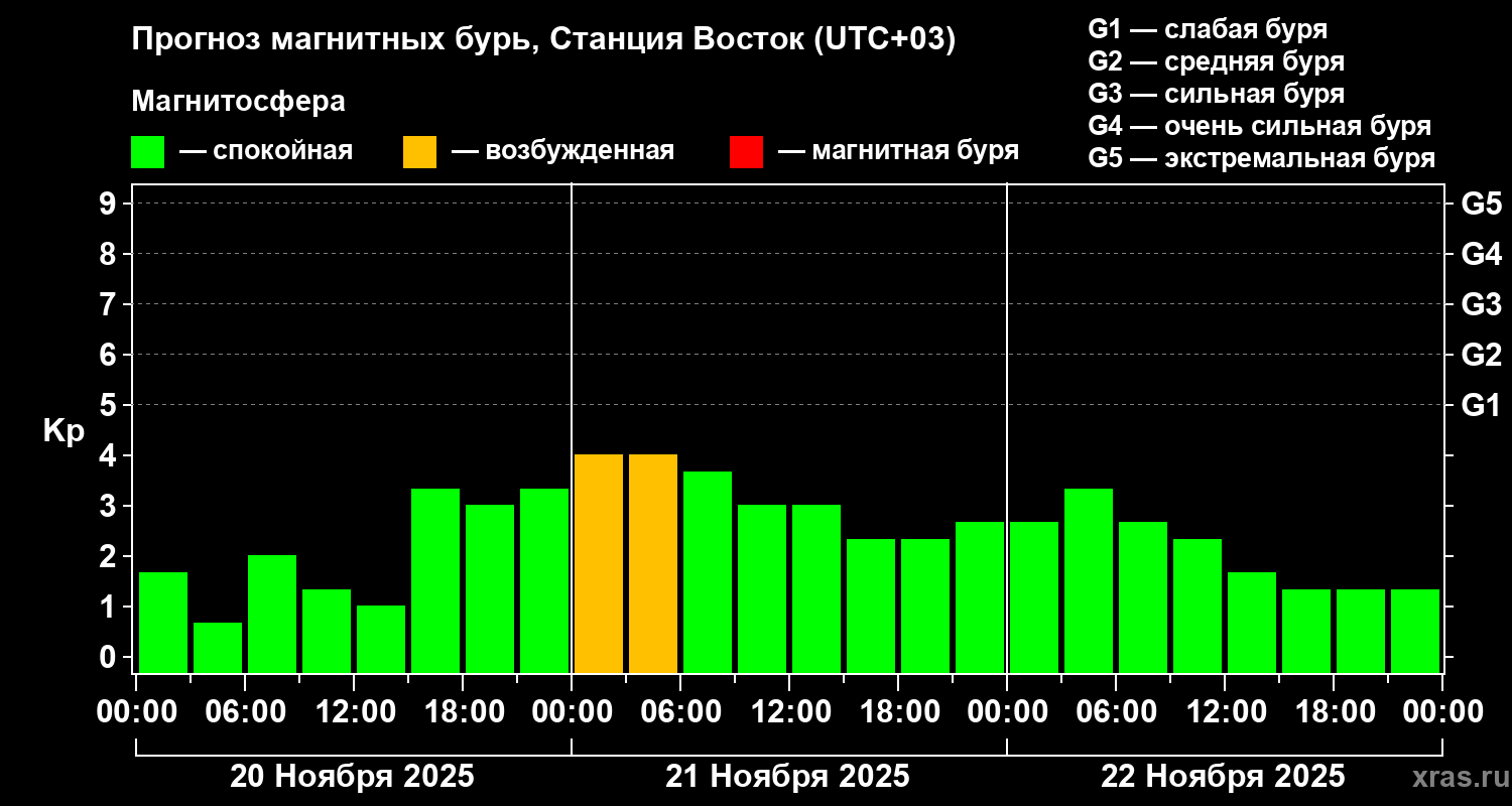 Прогноз магнитных бурь локации Станция Восток — 20 ноября 2025 года