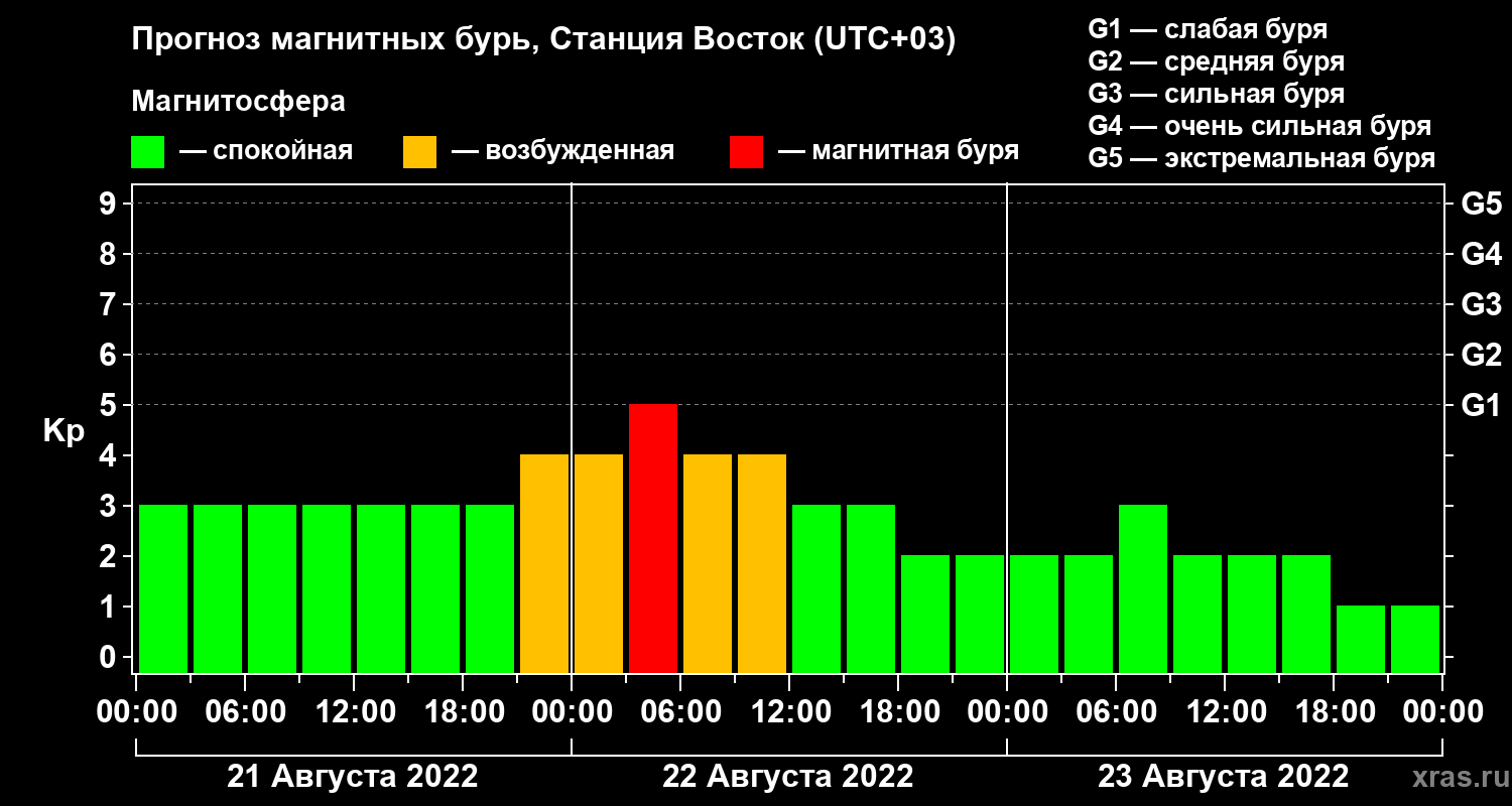 Прогноз магнитных бурь локации Станция Восток — 21 августа 2022 года