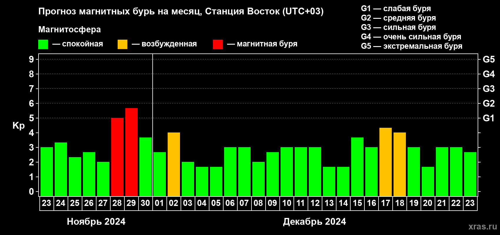 Прогноз магнитных бурь локации Станция Восток — 23 ноября 2024 года