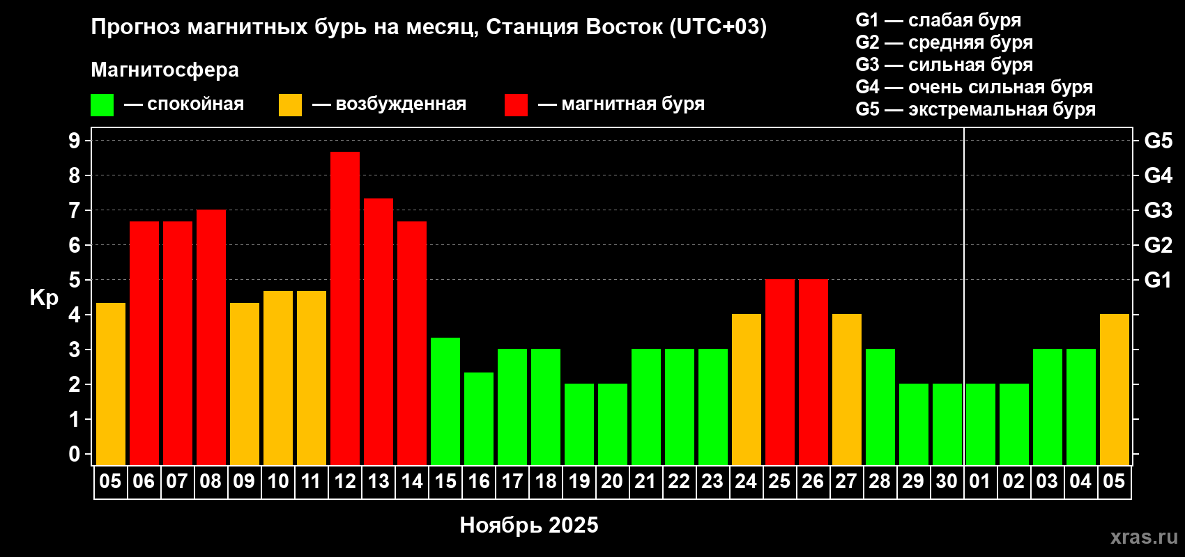 Прогноз магнитных бурь локации Станция Восток — 5 ноября 2025 года