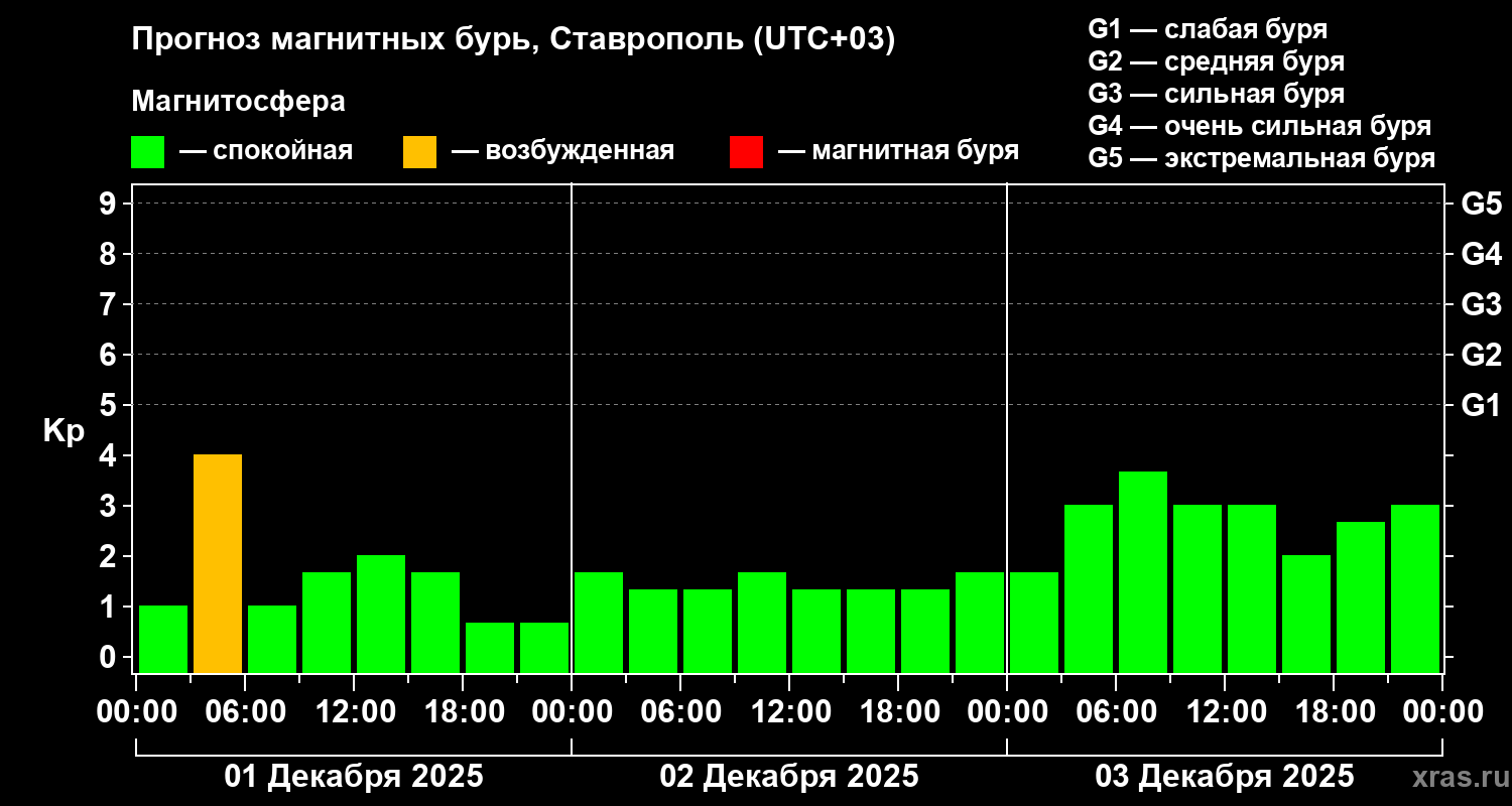 Прогноз магнитных бурь в Ставрополе на 1 декабря 2025 года