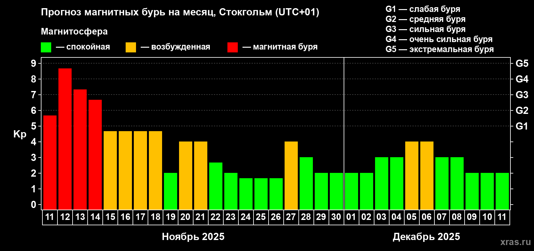 Прогноз магнитных бурь в Стокгольме — 11 ноября 2025 года