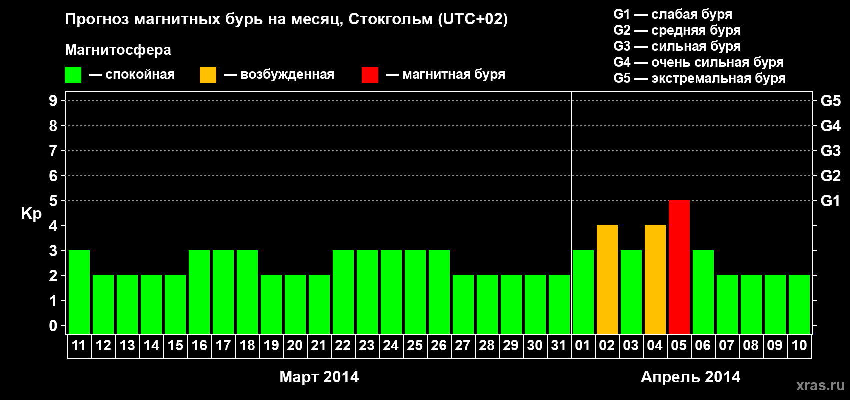 Прогноз максимального суточного геомагнитного индекса Kp на 1 месяц (31 день) с 11 марта по 10 апреля 2014 г