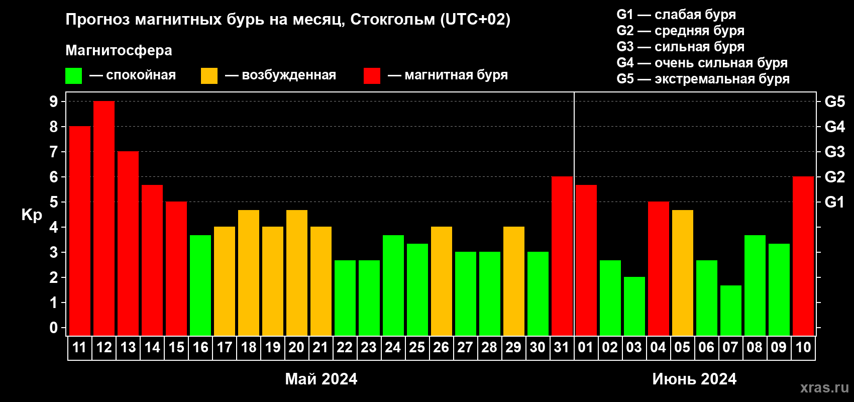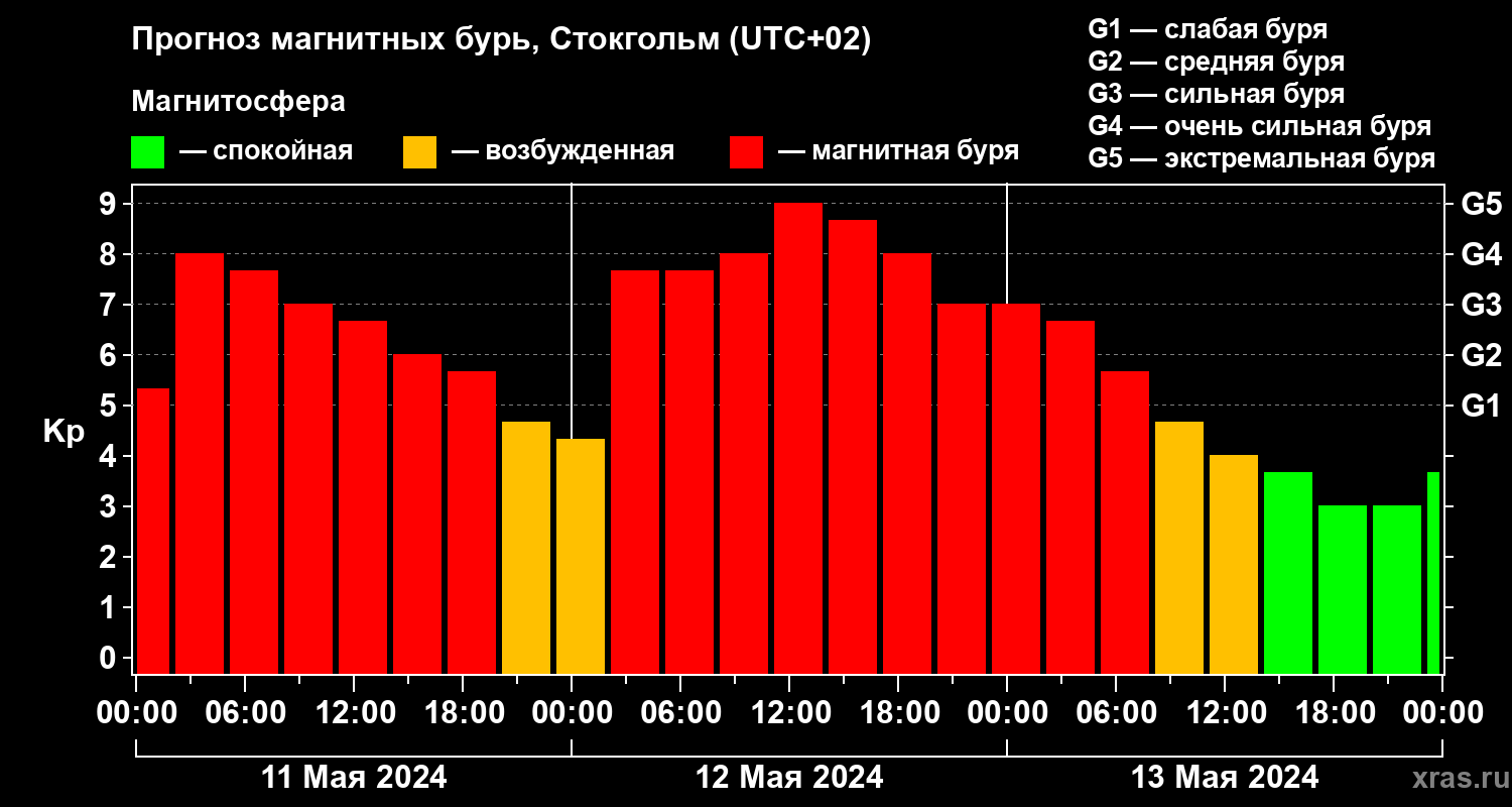 Прогноз магнитных бурь в Стокгольме — 11 мая 2024 года