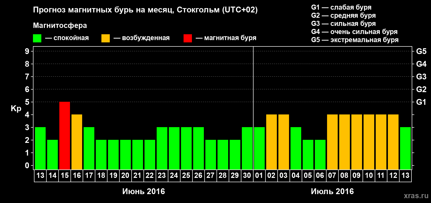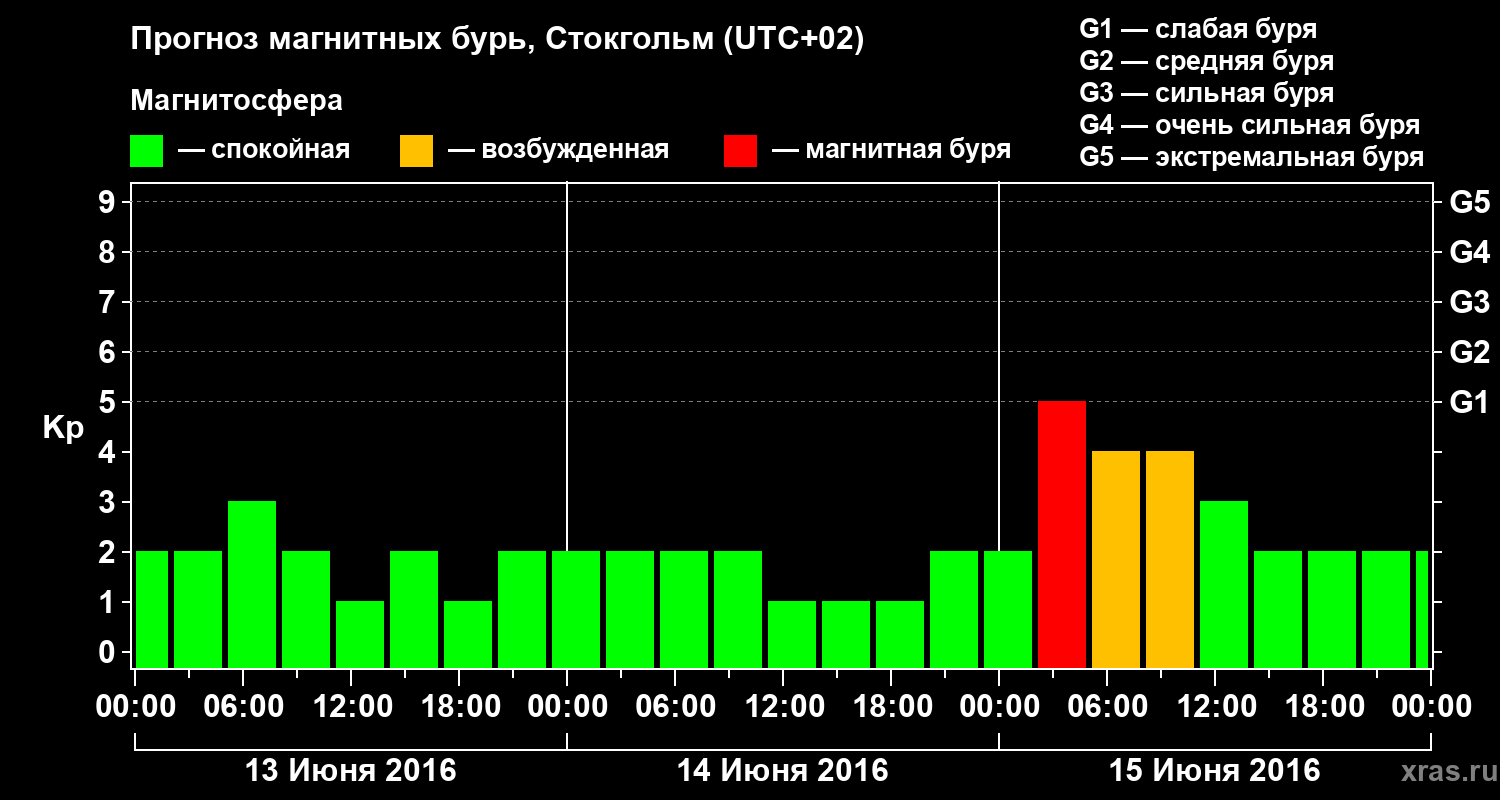 Прогноз магнитных бурь в Стокгольме — 13 июня 2016 года