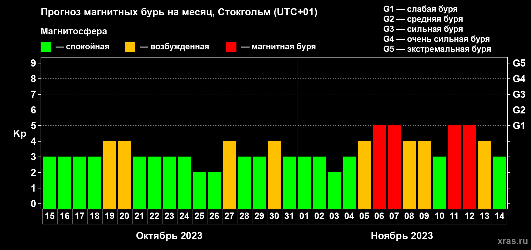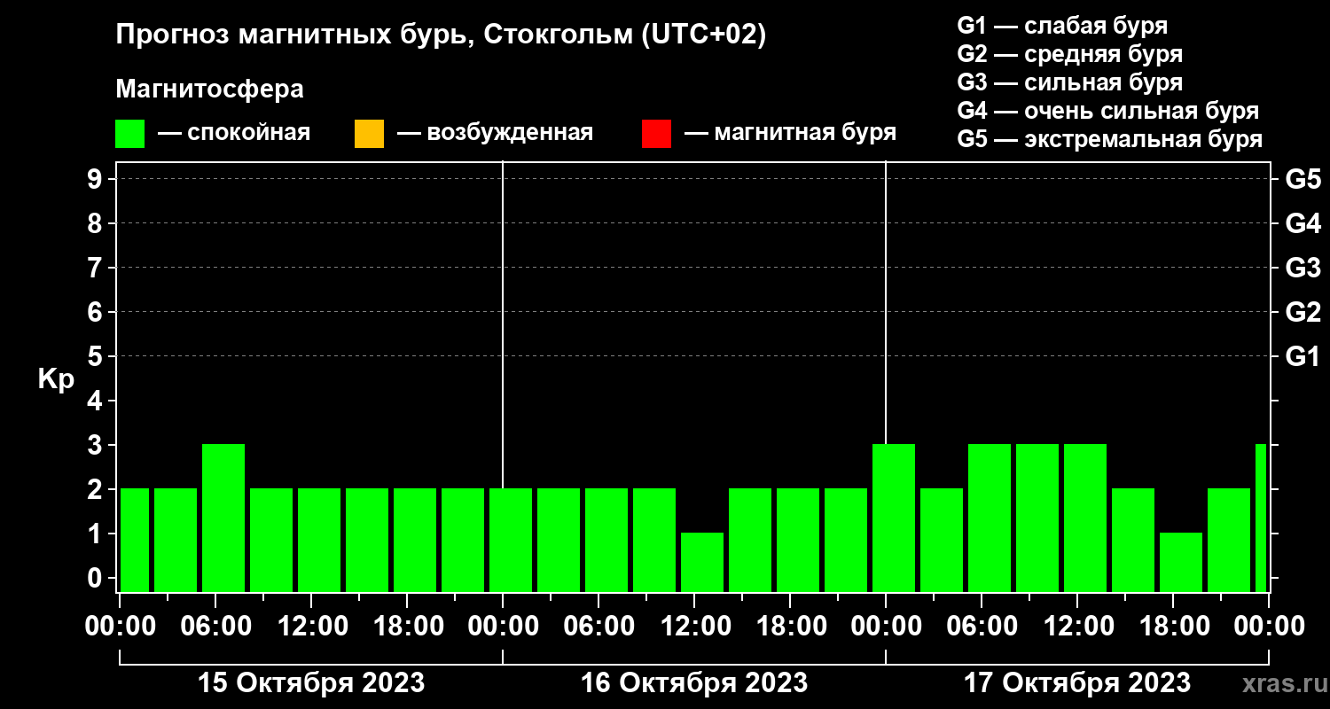 Прогноз магнитных бурь в Стокгольме — 15 октября 2023 года