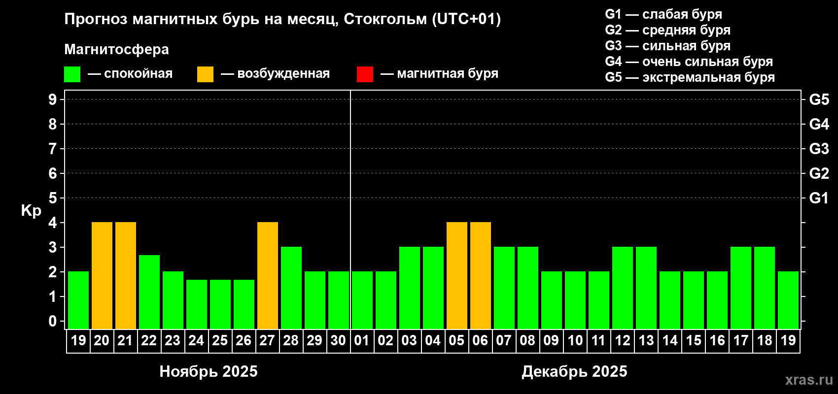 Прогноз магнитных бурь в Стокгольме — 19 ноября 2025 года